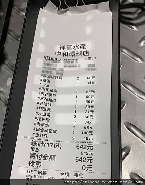 因為不喜歡沙茶火鍋的湯頭,所以選了一般湯頭,滋味一般般。我和朋友共吃了642元,帳單名細如下。祥富水產的好處是可自選食材,再依食材不同價位結帳,因此想吃什麼,想花多少都由自己選擇,食材的新鮮度也不差,不過有些食材的份量並不多。也因為只有結帳時才會和服務人員有交集,所以也談不上服務態度好不好。